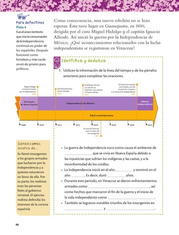 Como consecuencia, una nueva rebelión no se hizo esperar. Ésta tuvo lugar en Guanajuato, en 1810, dirigida por el cura Miguel Hidalgo y el capitán Ignacio Allende. Así inició la guerra por la Independencia de México. ¿Qué acontecimientos relacionados con la lucha independentista se registraron en Veracruz? Identifico y deduzco 1. Utilicen la información de la línea del tiempo y de los párrafos anteriores para completar las oraciones. Guadalupe Victoria y su ejército se enfrentan a los realistas en Puente del Rey 1815