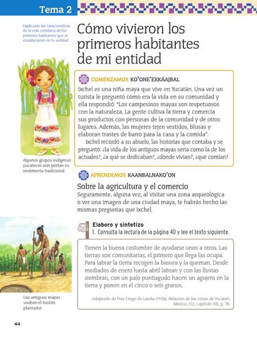 1. Consulta la lectura de la página 40 y lee el texto siguiente. ienen la buena costumbre de ayudarse unos a otros. Las T tierras son comunitarias, el primero que llega las ocupa. Para labrar la tierra recogen la basura y la queman. Desde mediados de enero hasta abril labran y con las lluvias siembran, con un palo puntiagudo hacen un agujero en la tierra y ponen en él cinco o seis granos. Los antiguos mayas usaban el bastón plantador.