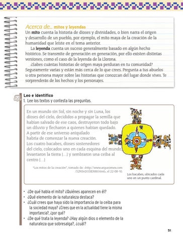 • ¿De qué habla el mito? ¿Quiénes aparecen en él? • ¿Qué elemento de la naturaleza destaca? • ¿Cuál crees que haya sido la importancia de la ceiba para la sociedad maya? ¿Crees que en la actualidad tiene la misma importancia?, ¿por qué? • ¿De qué trata la leyenda? ¿Hay algún dios o elemento de la naturaleza que sobresalga?, ¿cuál? 51