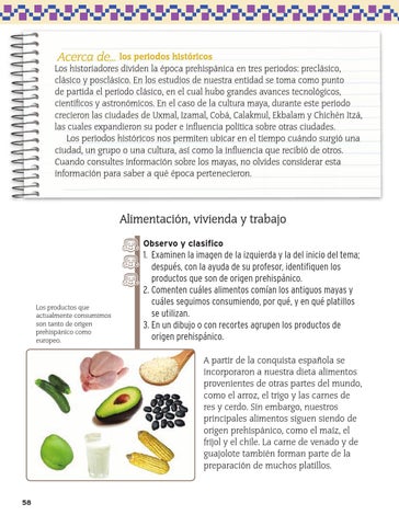 1. Examinen la imagen de la izquierda y la del inicio del tema; después, con la ayuda de su profesor, identifiquen los productos que son de origen prehispánico. 2. Comenten cuáles alimentos comían los antiguos mayas y cuáles seguimos consumiendo, por qué, y en qué platillos se utilizan. 3. En un dibujo o con recortes agrupen los productos de origen prehispánico. A partir de la conquista española se incorporaron a nuestra dieta alimentos provenientes de otras partes del mundo, como el arroz, el trigo y las carnes de res y cerdo. Sin embargo, nuestros principales alimentos siguen siendo de origen prehispánico, como el maíz, el frijol y el chile. La carne de venado y de guajolote también forman parte de la preparación de muchos platillos.