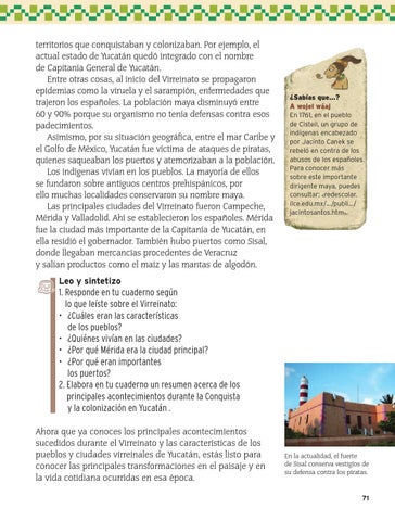 1. Responde en tu cuaderno según lo que leíste sobre el Virreinato: • ¿Cuáles eran las características de los pueblos? • ¿Quiénes vivían en las ciudades? • ¿Por qué Mérida era la ciudad principal? • ¿Por qué eran importantes los puertos? 2. E labora en tu cuaderno un resumen acerca de los principales acontecimientos durante la Conquista y la colonización en Yucatán . Ahora que ya conoces los principales acontecimientos sucedidos durante el Virreinato y las características de los pueblos y ciudades virreinales de Yucatán, estás listo para conocer las principales transformaciones en el paisaje y en la vida cotidiana ocurridas en esa época.