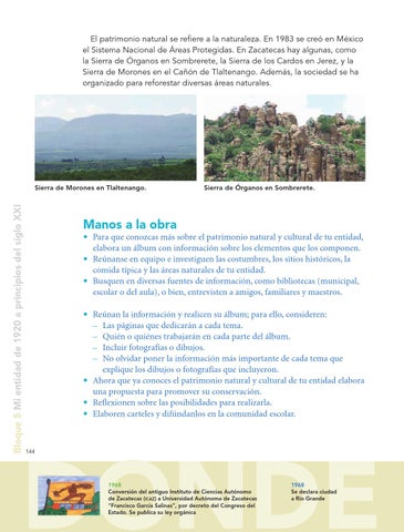 • Para que conozcas más sobre el patrimonio natural y cultural de tu entidad, elabora un álbum con información sobre los elementos que los componen. • Reúnanse en equipo e investiguen las costumbres, los sitios históricos, la comida típica y las áreas naturales de tu entidad. • Busquen en diversas fuentes de información, como bibliotecas (municipal, escolar o del aula), o bien, entrevisten a amigos, familiares y maestros. • Reúnan la información y realicen su álbum; para ello, consideren: – Las páginas que dedicarán a cada tema. – Quién o quiénes trabajarán en cada parte del álbum. – Incluir fotografías o dibujos. – No olvidar poner la información más importante de cada tema que explique los dibujos o fotografías que incluyeron. • Ahora que ya conoces el patrimonio natural y cultural de tu entidad elabora una propuesta para promover su conservación. • Reflexionen sobre las posibilidades para realizarla. • Elaboren carteles y difúndanlos en la comunidad escolar.