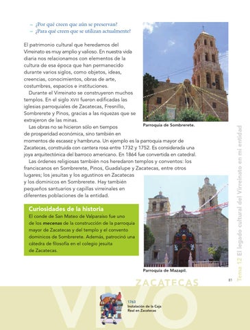 El patrimonio cultural que heredamos del Virreinato es muy amplio y valioso. En nuestra vida diaria nos relacionamos con elementos de la cultura de esa época que han permanecido durante varios siglos, como objetos, ideas, creencias, conocimientos, obras de arte, costumbres, espacios e instituciones. Durante el Virreinato se construyeron muchos templos. En el siglo xviii fueron edificadas las iglesias parroquiales de Zacatecas, Fresnillo, Sombrerete y Pinos, gracias a las riquezas que se extrajeron de las minas. Parroquia de Sombrerete. Las obras no se hicieron sólo en tiempos de prosperidad económica, sino también en momentos de escasez y hambruna. Un ejemplo es la parroquia mayor de Zacatecas, construida con cantera rosa entre 1732 y 1752. Es considerada una joya arquitectónica del barroco americano. En 1864 fue convertida en catedral. Las órdenes religiosas también nos heredaron templos y conventos: los franciscanos en Sombrerete, Pinos, Guadalupe y Zacatecas, entre otros lugares; los jesuitas y los agustinos en Zacatecas y los dominicos en Sombrerete. Hay también pequeños santuarios y capillas virreinales en diferentes poblaciones de la entidad.
