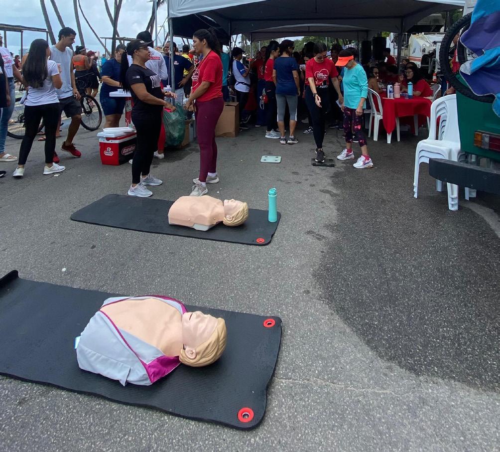 A ação do Dia Mundial do Coração, realizada na Orla da Ponta Verde em Maceió, contou com atividades voltadas para o cuidado com a saúde cardiovascular, como aferição de pressão, teste de glicemia, cálculo do índice de massa corporal e uma aula funcional para promover o bem-estar. Houve também orientações sobre alimentação saudável com dicas para reduzir o consumo de sal usando temperos naturais, além de uma estação de ressuscitação cardiopulmonar (RCP), ensinando habilidades essenciais para emergências, e uma gincana interativa que uniu aprendizado e diversão.