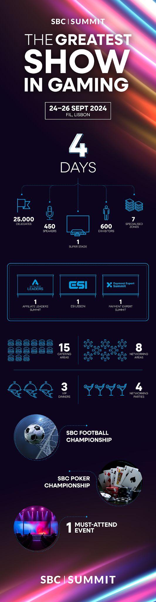 The SBC Summit Lisbon exhibition and conference has already established itself as both the largest and most must-attend digital event for betting and gaming industry professionals. It’s a global event with visitors from all regions across the world:Africa,Asia, Europe, LatinAmerica, and NorthAmerica. In 2024, SBC's flagship event, SBC Summit Lisbon will be bigger than ever with an exhibition and conference floor that now covers a massive 100,000 sqm, and will accommodate over 600 exhibitors.