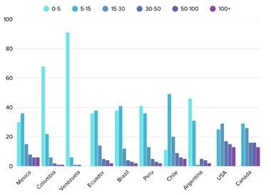 The only market that is remotely similar when it comes to deposit values is Colombia, where 90 per cent of average deposits are under 15 euros. However, the distribution of total deposits reflects the other Latam markets a little more closely, as can be seen in the table.