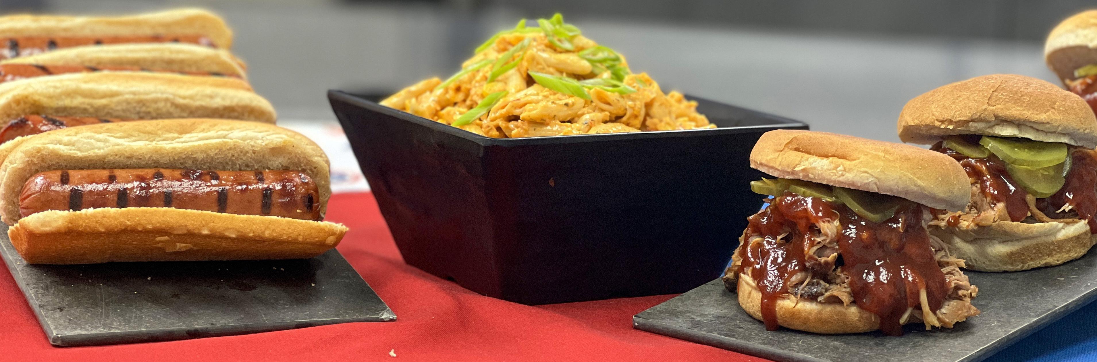 Grilled hot dogs and BBQ pulled pork served gourmet buns and sweet and smokey BBQ sauce. Fresh pasta salad with freshly popped popcorn and chocolate chip cookies.