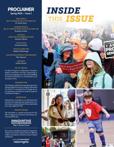 Advertising is accepted on an individual basis and does not imply editorial endorsement. For information, contact Brandon Pickett, bpickett@ sbcv.org or 888-234-7716. CREATIVE DESIGN The Proclaimer is created exclusively for the SBC of Virginia by Innovative Faith Resources: innovativefaith.org.