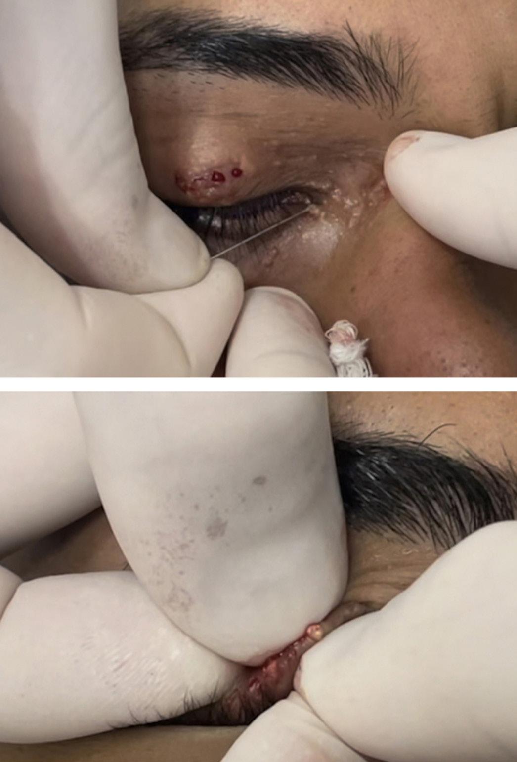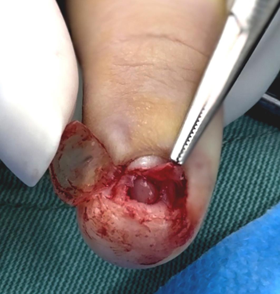 Durante o procedimento cirúrgico, observou-se um pertuito dirigindo-se ao tecido subcutâneo. O nódulo inicial foi removido e enviado para exame anatomopatológico; o procedimento foi então interrompido. O paciente foi encaminhado para realização de radiografia e ultrassonografia, que evidencia-