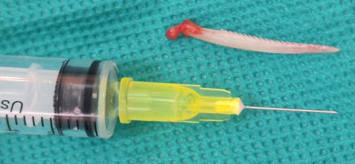 Foi realizada nova abordagem cirúrgica, agora mais ampla e profunda, guiada pelos achados de imagem. Durante o procedimento, identificou-se uma estrutura de consistência ósseo-cartilaginosa, serrilhada, reconhecida pelo próprio paciente como o ferrão do peixe mandi (Figuras 3 e 4).