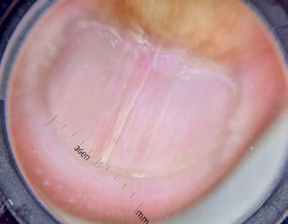 Figure 2: Onychoscopy showing a homogeneous white area and arborizing vessels