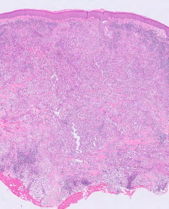 Histological analysis, performed with hematoxylin–eosin staining, demonstrated proliferation of fibroblastic cells and numerous thick, closely packed collagen bundles, regularly distributed within the dermis (Figure 3).These findings are consistent with the diagnosis of ADFK.