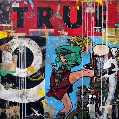 Greg Miller is a neo-pop artist known for blending language, story, and image to foster a dialogue between the audience and the painting. Embracing the term “contemporary cave painter,” he creates realistic images based on films, old magazines, and books. Inspired by the 1974 film noir Chinatown, Miller’s recent painting TRUE portrays a woman in a heroic light. Unlike other artists, Miller aims for clarity in his work, leaving little room for interpretation