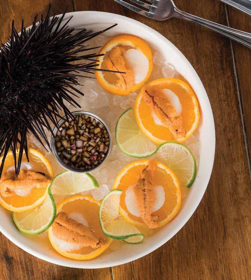 LOCAL UNI, WORLD RENOWNED SANTA BARBARA RED SEA URCHIN, SERVED ATOP SLICED RAW SCALLOPS ON FRESH ORANGE PINWHEELS WITH PONZU SAUCE FISHOUSE ON CABRILLO BOULEVARD