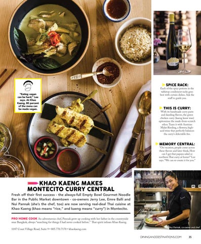 Fresh off their first success - the always-full Empty Bowl Gourmet Noodle Bar in the Public Market downtown - co-owners Jerry Lee, Emre Balli and Nui Pannak (she’s the chef, too) are now serving real-deal Thai cuisine at Khao Kaeng (khao means “rice,” and kaeng means “curry”) in Montecito. PRO HOME COOK An adventurous chef, Pannak grew up cooking with her father in the countryside near Bangkok, always “searching for things I had never cooked before.” That spirit infuses Khao Kaeng. 1187 Coast Village Road, Suite 9 • 805.770.7170 • khaokaeng.com