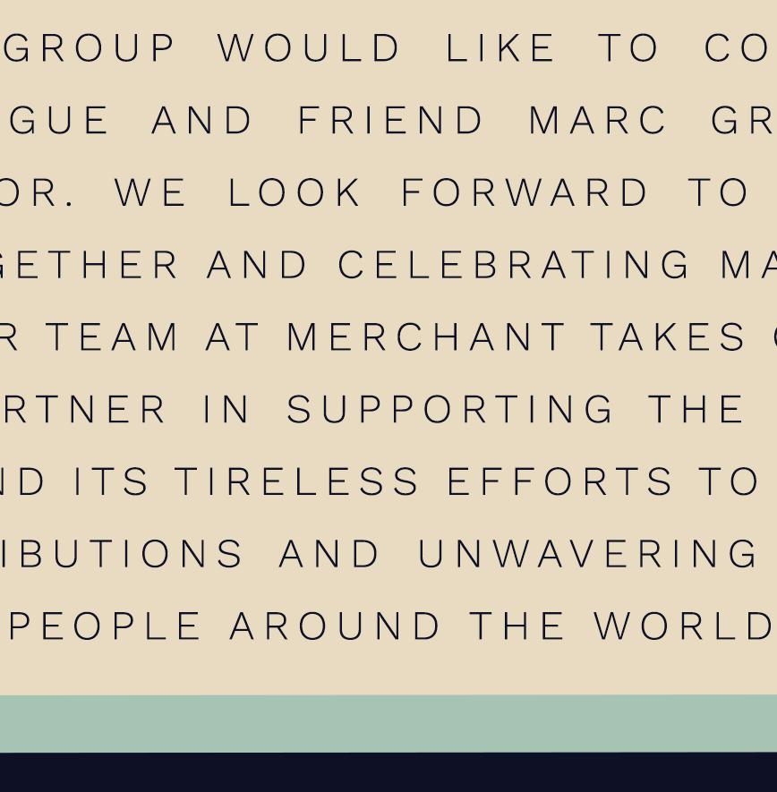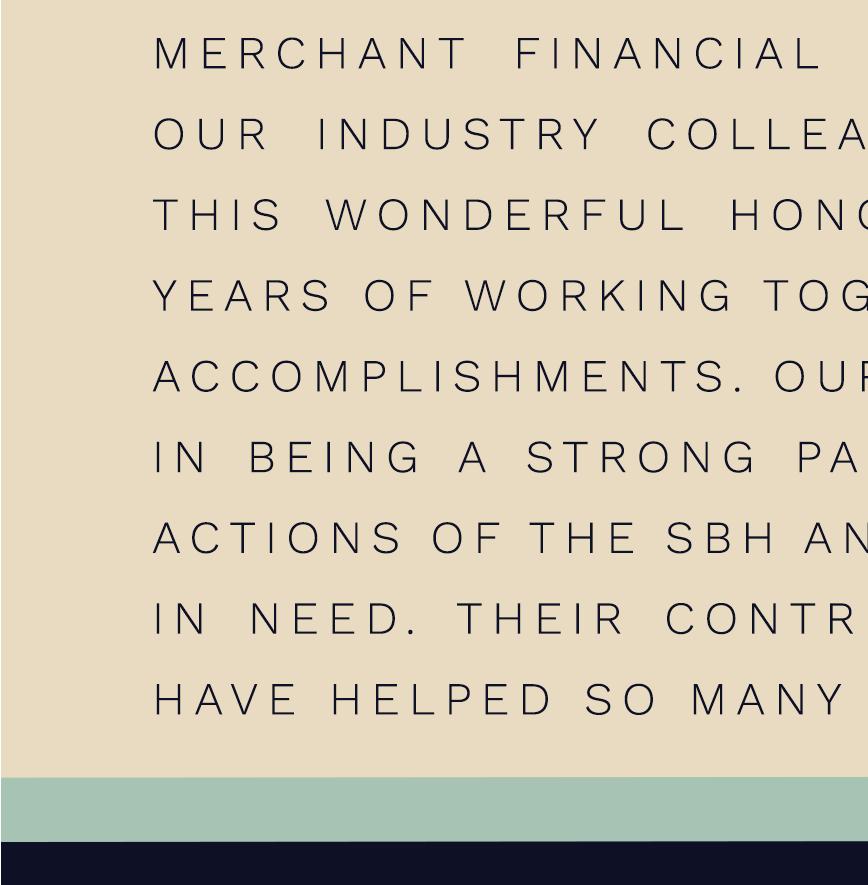 MERCHANT FINANCIAL GROUP WOULD LIKE TO CONGRATULATE OUR INDUSTRY COLLEAGUES AND FRIENDS MICHAEL HUDGENS AND JASON GOLDBERG ON THIS WONDERFUL HONOR. WE LOOK FORWARD TO MANY MORE YEARS OF WORKING TOGETHER AND CELEBRATING MANY MORE ACCOMPLISHMENTS. OUR TEAM AT MERCHANT TAKES GREAT PRIDE IN BEING A STRONG PARTNER IN SUPPORTING THE VALUES AND ACTIONS OF THE SBH AND ITS TIRELESS EFFORTS TO HELP THOSE IN NEED. THEIR CONTRIBUTIONS AND UNWAVERING DEDICATION HAVE HELPED SO MANY PEOPLE AROUND THE WORLD.