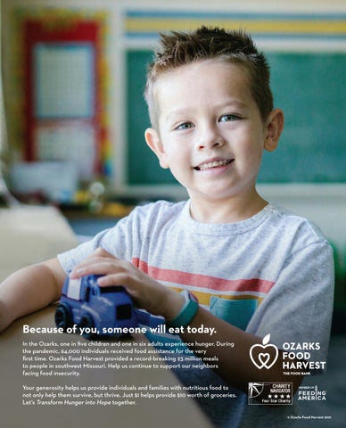 Because of you, someone will eat today. In the Ozarks, one in five children and one in six adults experience hunger. During the pandemic, 64,000 individuals received food assistance for the very first time. Ozarks Food Harvest provided a record-breaking 23 million meals to people in southwest Missouri. Help us continue to support our neighbors facing food insecurity. Your generosity helps us provide individuals and families with nutritious food to not only help them survive, but thrive. Just $1 helps provide $10 worth of groceries. Let’s Transform Hunger into Hope together. SPRINGFIELD BUSINESS JOURNAL | ADVERTISING SUPPLEMENT