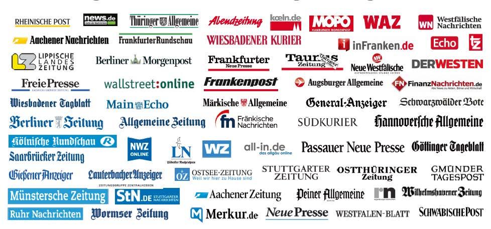TARGETING & LEAD-TOOLS 26 NATIVE ADVERTORIALS • Erstellung der verschiedenen Text-Bild-Anzeigen 1. Text + Bild 455,– €* 2. Text + Bild + Advertorial 610,– €* CPC (COST PER CLICK) • Kosten für Click 4,– €* (Mindestvolumen 200 Clicks) Sie erreichen Ihre Branchen-Zielgruppe mit Content Advertising vornehmlich auf über 100 Tageszeitungs-Webseiten in Deutschland: * Alle Preise zzgl. Mwst. + evtl. AE-Prov.