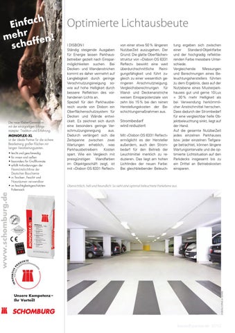 tung ergeben sich zwischen einer Standard-Objektfarbe und der hochgradig reflektierenden Farbe messbare Unterschiede. Vergleichende Messungen und Berechnungen eines Beleuchtungsherstellers führten zu dem Ergebnis, dass auf der Nutzebene eines Musterparkhauses gut und gerne 10 Lux = 30 % mehr Helligkeit als bei Verwendung herkömmlicher Anstrichmittel herrschen. Dass dadurch der Strombedarf für eine vergleichbar helle Objektbeleuchtung sinkt, liegt auf der Hand. Auf die gesamte NutzbarZeit jedes einzelnen Parkhauses bzw. jeder einzelnen Tiefgarage betrachtet, können längere Wartungsintervalle und die optimierte Lichtsituation auf den Parkdecks insgesamt bis zu ein Drittel an Betriebskosten einsparen.