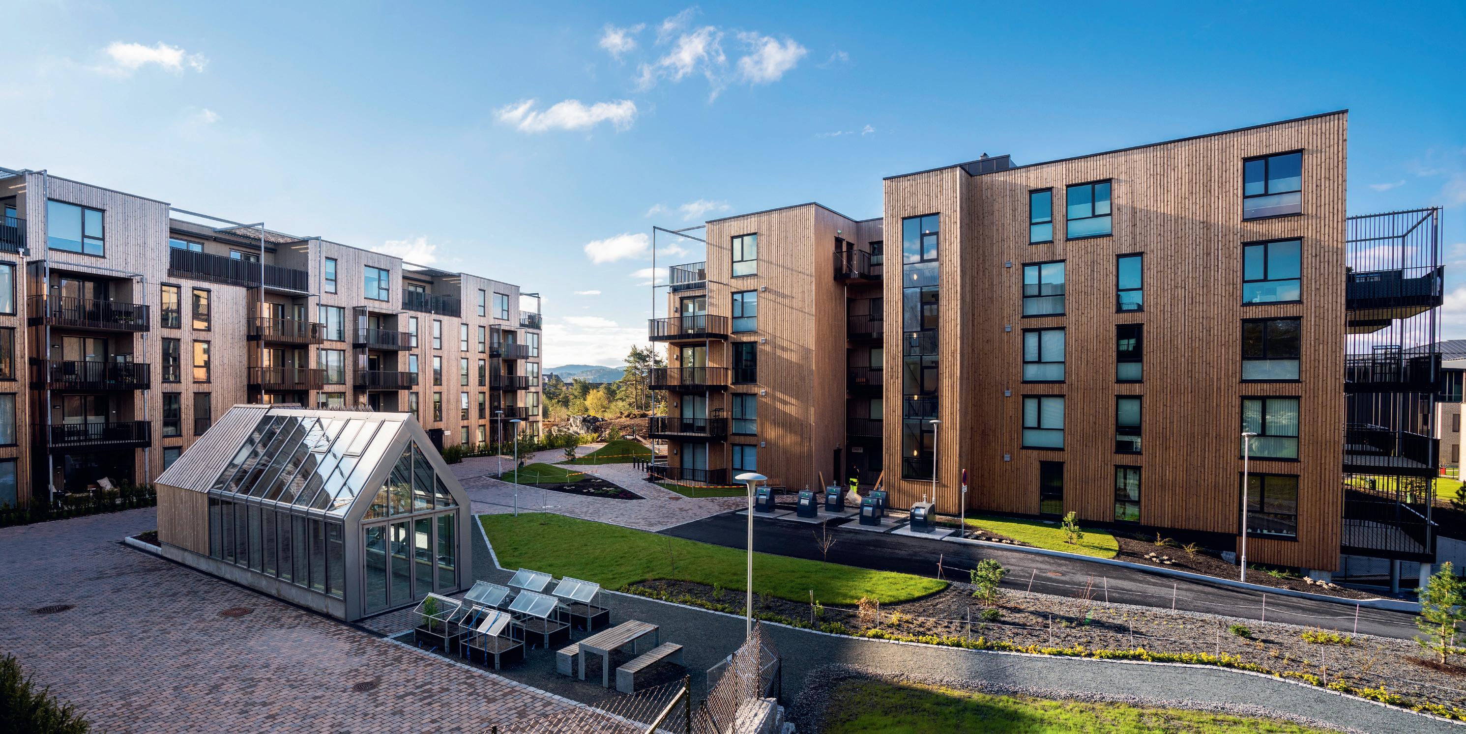 Feuerhemmend veredelt: Thermory stattet Fassaden ab sofort auch mit brandschutztechnisch optimierten Design-Hölzern aus – bei diesem Mehrfamilienhaus in Norwegen z. B. mit Thermory Benchmark ThermoKiefer Profil C34 Mix & Match.