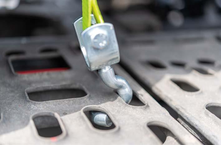 Neben dem Haken an der Druckratsche wird das Zurrsystem an zwei weiteren Punkten an dem Lochblech des Fahrzeugtransporters befestigt. Zur sicheren Befestigung stehen hier verschiedene Verbindungselemente zur Verfügung. In der Standardausstattung werden »CarFix« und »TruckFix« mit zwei Wirbelhaken ausgestattet. Optional sind zudem Varianten mit dem »Snake-Hook« und »45-Hook« möglich, die deutlich schonender für das Lochblech sind. Der um 360 Grad drehbare »Snake-Hook« ist am Losende und als freilaufender Haken einsetzbar. Durch seine Form erreicht er eine große Kontaktfläche zum Blech, was für eine optimale Krafteinleitung sorgt, sodass auch bei hohen Belastungen Beschädigungen an den Lochblechen vermieden werden. Der »45 Hook« bietet dieselben Vorteile, wird jedoch ausschließlich freilaufend am Losende verbaut.
