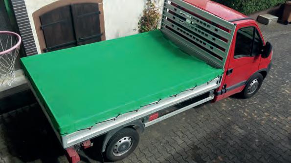 Ich bin: eine frei konfektionierbare Pritschenplane aus luftund wasserdurchlässigem PE mit 2 oder 4 ausgeformten Ecken und gut als: Ladungsabdeckung bei Transportern o.ä.