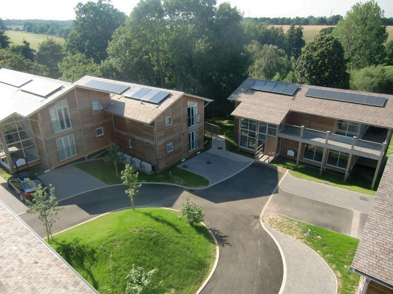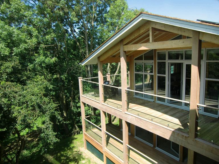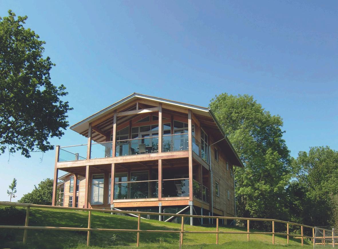 The lodges feature natural cedar tiles on the rooves, which age to a beautiful silver grey, and the exterior walls are clad with Iroko wood sourced from sustainable forests. Each eco-lodge is fitted with photovoltaic and solar panels as well as air source heat pumps, which together provide 100% of the green energy supply required for their underfloor heating, lighting, and hot water.