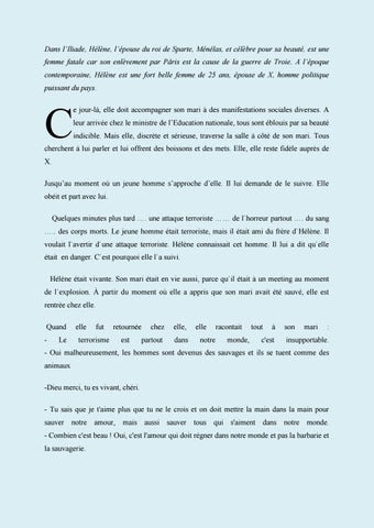 cherchent à lui parler et lui offrent des boissons et des mets. Elle, elle reste fidèle auprès de X. Jusqu’au moment où un jeune homme s’approche d’elle. Il lui demande de le suivre. Elle obéit et part avec lui. Quelques minutes plus tard …. une attaque terroriste …… de l`horreur partout …. du sang ….. des corps morts. Le jeune homme était terroriste, mais il était ami du frère d`Hélène. Il voulait l`avertir d`une attaque terroriste. Hélène connaissait cet homme. Il lui a dit qu`elle était en danger. C`est pourquoi elle l`a suivi. Hélène était vivante. Son mari était en vie aussi, parce qu`il était à un meeting au moment de l`explosion. À partir du moment où elle a appris que son mari avait été sauvé, elle est rentrée chez elle. Quand -