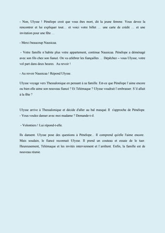 - Non, Ulysse ! Pénélope croit que vous êtes mort, dit la jeune femme. Vous devez la rencontrer et lui expliquer tout… et voici votre billet … une carte de crédit … et une invitation pour une fête … - Merci beaucoup Nausicaa. - Votre famille n`habite plus votre appartement, continue Nausicaa. Pénélope a déménagé avec son fils chez son fiancé. On va célébrer les fiançailles … Dépêchez – vous Ulysse, votre vol part dans deux heures. Au revoir ! - Au revoir Nausicaa ! Répond Ulysse. Ulysse voyage vers Thessalonique en pensant à sa famille. Est-ce que Pénélope l`aime encore ou bien elle aime son nouveau fiancé ? Et Télémaque ? Ulysse voudrait l`embrasser. S’il allait à la fête ?