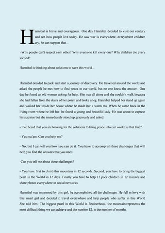 Hannibal decided to pack and start a journey of discovery. He travelled around the world and asked the people he met how to find peace in our world, but no one knew the answer. One day he found an old woman asking for help. She was all alone and she couldn’t walk because she had fallen from the stairs of her porch and broke a leg. Hannibal helped her stand up again and walked her inside her house where he made her a warm tea. When he came back in the living room where he left her, he found a young and beautiful lady. He was about to express his surprise but she immediately stood up graciously and asked: - I’ve heard that you are looking for the solutions to bring peace into our world, is that true? - Yes ma’am. Can you help me? - No, but I can tell you how you can do it. You have to accomplish three challenges that will help you find the answers that you need. -Can you tell me about these challenges? - You have first to climb this mountain in 12 seconds. Second, you have to bring the biggest pearl in the World in 12 days. Finally you have to help 12 poor children in 12 minutes and share photos everywhere in social networks Hannibal was impressed by this girl, he accomplished all the challenges. He fell in love with this smart girl and decided to travel everywhere and help people who suffer in this World She told him: The biggest pearl in this World is Brotherhood, the mountain represents the most difficult thing we can achieve and the number 12, is the number of months.