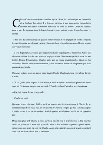 pour la vie, il a toujours réussi à divertir les autres, ceux qui ont besoin d’un refuge dans ce monde. Il était hors du commun avec ses qualités extraordinaires et son engagement contre toutes les formes d’injustice sociale et de racisme. Dans ses films, il appelait ses semblables au respect des valeurs humaines. Un jour de printemps, pendant qu’il se promenait dans un parc public, il rencontra Adèle, une chanteuse célèbre dont la voix suave et magique éclaire l’horizon et que la richesse de son timbre dépasse l’imagination. Chaplin, épris par sa beauté exceptionnelle, décida de lui déclarer sa flamme, mais malheureusement, Adèle refusa son amour car elle pensait qu’il était pauvre et sans famille. Quelques instants après, un gamin passa devant Charlie Chaplin et d’une voix pleine de joie s’écria : - Oh !!! Quelle belle surprise ! Mon Héros, Charlie Chaplin ! Je voudrais prendre un selfie avec toi. C'est quand ton prochain spectacle ? Tous les enfants l’attendent avec impatience. Adèle était ébahie devant ce spectacle… …Charlie est parti. Quelques heures plus tard, Adèle a surfé sur internet et a écrit un message à Charlie. Ils se sont rencontrés et ont bu du café. Ils ont discuté et Charlie a compris qu`il ne s`intéressait plus à Adèle. Alors, il est parti trop déçu. Adèle l`appelait au téléphone, mail il ne lui répondait pas. Deux mois plus tard, Charlie a pensé qu'il n`a pas été poli et a téléphoné à Adèle pour lui dédier un poème qu`il avait écrit pour elle. Mais, Adèle a chanté ce poème à grand succès, sans avouer qu`il avait été écrit par Charlie. Alors, elle a gagné beaucoup d`argent en vendant des CD. Charlie ne voulait plus la rencontrer.