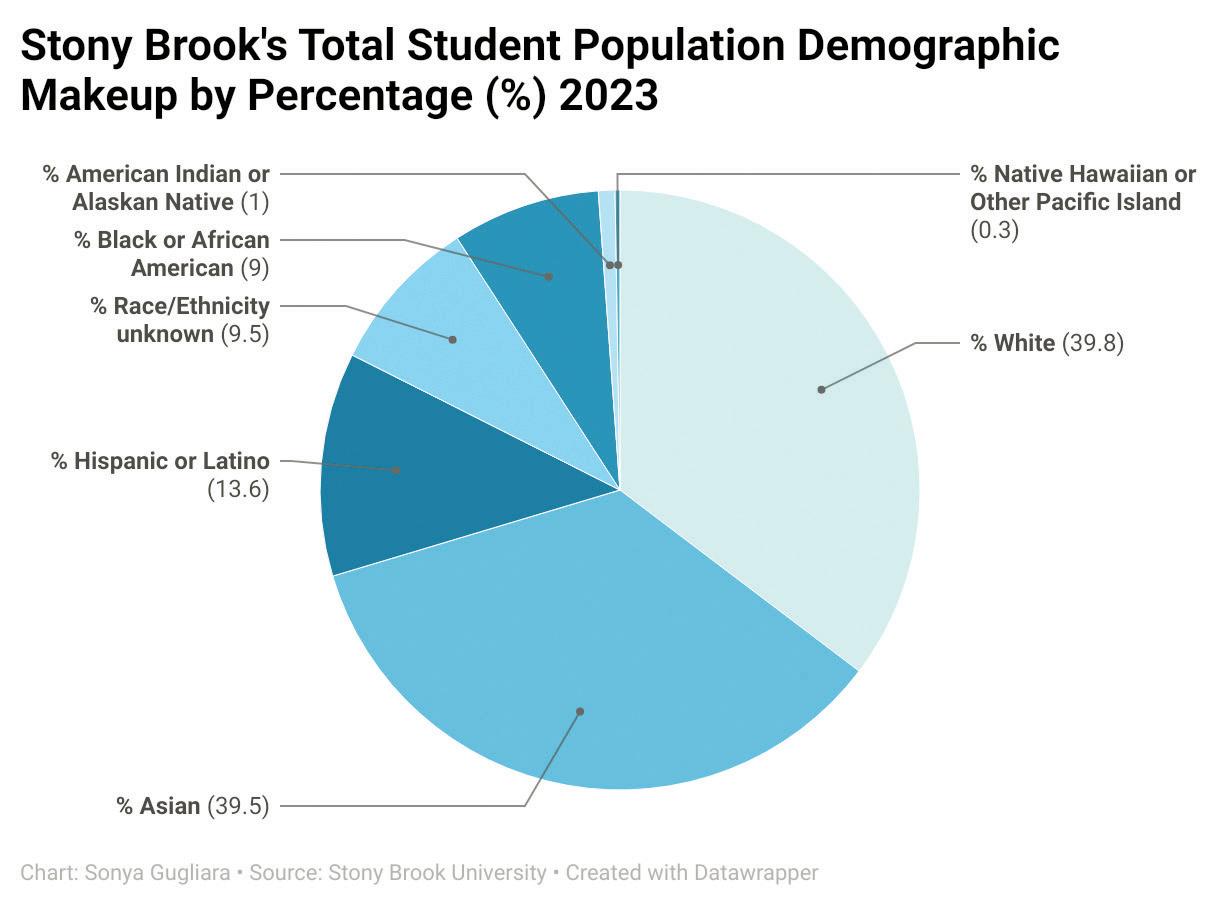 As of fall 2023, Stony Brook’s undergraduate student body is 45% Asian, 37% White, 15.4% Hispanic or Latino and 9.7% African American or Black. Other ethnic groups make up only 1.4% of this population and 6.2% of the student body falls into the “unknown” category.