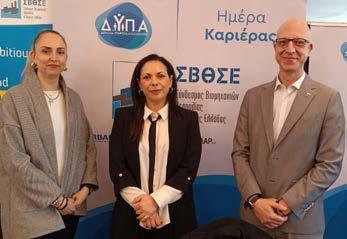 ΣΥΝΔΕΣΜΟΣ ΒΙΟΜΗΧΑΝΙΩΝ ΘΕΣΣΑΛΙΑΣ & ΣΤΕΡΕΑΣ ΕΛΛΑΔΟΣ | 15 ΕΠΙΛΟΓΕΣ ΑΠΟ ΤΙΣ ΔΡΑΣΤΗΡΙΟΤΗΤΕΣ ΜΑΣ ◗ από την πλευρά του Π.Θ. από τον Πρύτανη του Πανεπιστημίου Θεσσαλίας κ. Χαράλαμπο Μπιλλίνη, Καθηγητή του Τμήματος Κτηνιατρικής, τον Αντιπρύτανη Διεθνών Σχέσεων, Εξωστρέφειας και Διά Βίου Εκπαίδευσης κ. Σπυρίδωνα Α. Καραμάνο, Καθηγητή του Τμήματος Μηχανολόγων Μηχανικών, και από την επικεφαλής της Μονάδας Καινοτομίας – Μεταφοράς Τεχνολογίας και Κέντρο Επιχειρηματικότητας του Πανεπιστημίου Θεσσαλίας κ. Χρυσή Λασπίδου, Καθηγήτρια του Τμήματος Πολιτικών Μηχανικών. από την πλευρά του Συνδέσμου Βιομηχανιών Θεσσαλίας και Στερεάς Ελλάδος, από τον Πρόεδρο του ΣΒΘΣΕ κ. Αθανάσιο Συριανό, από την Αντιπρόεδρο κ. Ελένη Κολιοπούλου και από την Υποδιευθύντρια του Συνδέσμου και Υπεύθυνη του Τμήματος ΣΒΘΣΕ/Enterprise Europe Network-Hellas κ. Γεωργία Φράγκου. Στο πλαίσιο των εκδηλώσεων "Ημέρες Καριέρας Δ.ΥΠ.Α" που διοργανώνονται από την ΔΥΠΑ στοχεύοντας στην εξωστρέφεια και στην αναβάθμιση των παρεχόμενων υπηρεσιών προς την κοινωνία μέσω καινοτόμων πρωτοβουλιών, ο Σύνδεσμος συμμετείχε την Πέμπτη 21 Μαρτίου 2024 στην «27η Ημέρα Καριέρας», που πραγματοποιήθηκε στο ξενοδοχείο Domotel Xenia στον Βόλο. Άμεσος στόχος της εκδήλωσης ήταν η αποτελεσματική σύζευξη των αναγκών της αγοράς εργασίας με το κατάλληλο εργατικό δυναμικό, ενώ απώτερη φιλοδοξία, τόσο του Συνδέσμου, όσο και της Δ.ΥΠ.Α., είναι η εδραίωση μίας ουσιαστικής συνεργασίας του ΚΠΑ2 Βόλου με τις επιχειρήσεις του Νομού Μαγνησίας και ευρύτερα. Στην εκδήλωση συμμετείχαν περισσότερες από 40 επιχειρήσεις, οι οποίες αναζητούσαν προσωπικό προκειμένου να καλύψουν πάνω από 1200 κενές θέσεις εργασίας, ενώ στους αναζητούντες εργασία δόθηκε η ευκαιρία άμεσης επαφής με τις επιχειρήσεις, διενέργειας συνεντεύξεων και κατάθεσης βιογραφικών. Η διοργάνωση στέφθηκε με επιτυχία, ενώ στην εκδήλωση παρευρέθηκαν επίσης ο Διοικητής ΔΥΠΑ κ. Σπ. Πρωτοψάλτης καθώς και οι Υποδιοικητές κ.κ. Βασίλης Γεωργιάδης και Γιώργος Καραχάλιος. Παρούσα στην εκδήλωση ήταν και η Περιφερειακή Διευθύντρια ΔΥΠΑ Θεσσαλίας κ. Όλγα Τσιούρβα και η Προϊσταμένη του Τμήματος Επαγγελματικής Εκπαίδευσης, Ο ΣΎΝΔΕΣΜΟΣ ΣΤΗΝ 27Η ΗΜΕΡΑ ΚΑΡΙΕΡΑΣ ΤΗΣ ΔΎΠΑ ΣΤΟΝ ΒΟΛΟ Κατάρτισης και ΒΝΣ Περ/κης Δ/νσης ΔΥΠΑ Θεσσαλίας, κ. Κέλλυ Γεροστέργιου. Εκπροσωπώντας τις επιχειρήσεις-μέλη από τη Μαγνησία και τη Λάρισα, στο περίπτερο του Συνδέσμου συνάντησαν τους υποψήφιους εργαζόμενους η Υπεύθυνη Εταιρικών Σχέσεων & Εξωστρέφειας κ. Χρ. Ζαρμπούνη και η Υπεύθυνη Ανθρώπινου Δυναμικού και Αγοράς Εργασίας κ. Ζωή Μιχαήλ. Στην εκδήλωση παρευρέθηκε επίσης ο Γενικός Διευθυντής του Συνδέσμου κ. Β. Κλειτσογιάννης, ο οποίος είχε συναντήσεις με όλους τους εκπροσώπους της ΔΥΠΑ επιβεβαιώνοντας την πρόθεση του Συνδέσμου να στηρίξει τις πρωτοβουλίες και να συνεργαστεί για τους κοινούς σκοπούς των δύο φορέων.