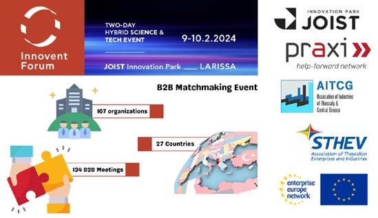 Event που πραγματοποιήθηκε στο Joist Innovation Park, στη Λάρισα, την Παρασκευή και το Σάββατο 9-10 Φεβρουαρίου 2024. Η εκδήλωση διοργανώθηκε από κοινού με το Δίκτυο ΠΡΑΞΗ, συντονιστή φορέα του Δικτύου Enterprise Europe NetworkHellas, τον Σύνδεσμο Θεσσαλικών Επιχειρήσεων και Βιομηχανιών – ΣΘΕΒ και το JOIST. Η πρωτοβουλία αυτή πραγματοποιήθηκε στο πλαίσιο της υβριδικής διημερίδας Innovent Forum 2024, η οποία είχε ως κύριο θέμα την Τεχνολογία στην υπηρεσία του Ανθρώπου και η οποία φιλοξένησε πλήθος εκθετών, ομιλιών, workshops, συζητήσεων στρογγυλής τραπέζης και παρουσιάσεις καινοτόμων προϊόντων με κεντρικό θεματικό άξονα το “Tech for Humanity” και εστίαση στους τομείς της Εκπαίδευσης, του Περιβάλλοντος, της Ενέργειας, των Έξυπνων Πόλεων, του Gaming, του Πολιτισμού και του Κατασκευαστικού Τομέα. Από το Δίκτυο ΠΡΑΞΗ, συντονιστή φορέα του Δικτύου Enterprise Europe Network-Hellas, συμμετείχαν στη διοργάνωση των διμερών συναντήσεων μεταξύ επιχειρήσεων, οργανισμών και ερευνητών οι Δρ. Αχιλλέας Μπάρλας και Κωνσταντίνος Κουτσογιάννης. Εκ μέρους του ΣΒΘΣΕ συνεργάστηκαν με τους συναδέλφους τους στο Δίκτυο ΠΡΑΞΗ στη διοργάνωση και υλοποίηση της συναντήσεων η Υπεύθυνη του ΣΒΘΣΕ/Enterprise Europe Network κ. Γεωργία Φράγκου, η Υπεύθυνη Εταιρικών Σχέσεων και Εξωστρέφειας κ. Κρις-Έλεν Ζαρμπούνη, και ο Υπεύθυνος Μηχανοργάνωσης, Ποιότητας & Εκπαίδευσης κ. Βασίλειος Ζυγούρας. Τις εργασίες της διημερίδας παρακολούθησε δια ζώσης ο Γενικός Διευθυντής του Συνδέσμου κ. Βασίλειος Κλειτσογιάννης.