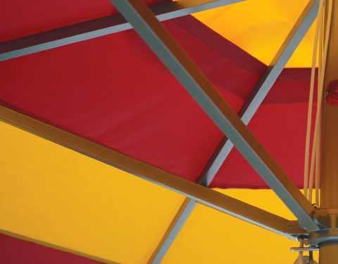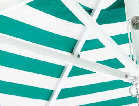 The Cirque umbrella’s canopy is created by seaming together two solid colors of awning fabric to create a custom stripe pattern. The seamstresses at Santa Barbara Designs developed this unique umbrella in their Southern California workroom to address the need for more variation in customized canopy colors. Thousands of unique color block combinations are possible.