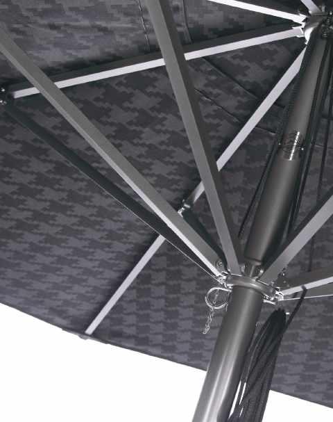 Vogue incorporates a sleek aluminum frame from the Paseo collection, with eight standard powder coat color options. The frame is coated with an anodized finish prior to powder coating. Aluminum hubs and stainless steel arm connectors further fortify this sleek, refined umbrella. Vogue is available in square and hexagonal shapes.