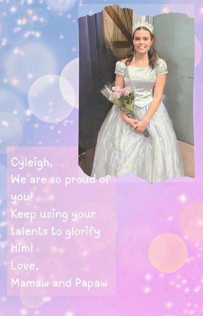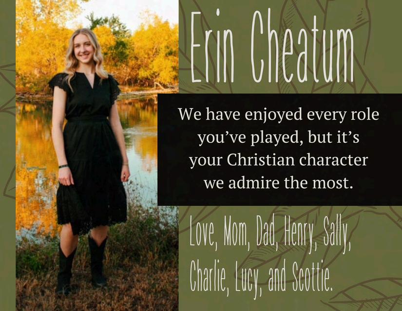 ErinCheatumisaseniorandhasattendedSCAsincekindergarten.Shehasbeen involvedwiththeSCADramaDepartmentsincethe3rdgrade.Shehasbeeninmany showssince,including:BeautyandtheBeast,PeterPan,WhiteChristmas,Pilgrim,Mary Poppins,YouCan’tTakeitwithYou,ThePlaythatGoesWrong,Anastasia,AGrandNight forSinging,SevenBridesforSevenBrothers,andLesMisérableswithherfavoritesbeing WhiteChristmasandLesMis!Shewouldliketothankherdirectorsandteacherswho havealwayspouredintoher,AbbyHannaford,Mrs.Chaney,Mrs.Hamlin,Mrs.Keely, HaileyDixon,andMr.andMrs.Fuller.Sheisgratefulforalloftheopportunitiesshe’s beengiventolearnandgrow!Shewouldalsoliketo thankallofherteacherswhohavebeensosupportiveof herextracurriculars!Erinwouldfinallyliketothank herfriendsandherfamilyespeciallyforbeingso supportiveinallshedoes!HerfavoriteBible passageisEphesians2:8-10.Dramahasbeen abigpartofErin’slifeandshehaslearneda lotaboutwhosheisinChristthroughit.