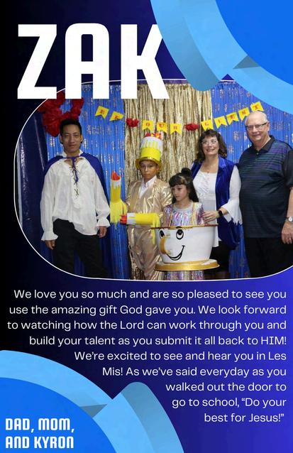 Eversinceshewasyoung,Belinda MayMyatNoehasbeencaptivated bythecreativeworkingsofamusical production.Ironically,itisonlywhen shefirstarrivedinSunriseChristian Academyduringhersenioryearthat shehadtheopportunitytojoincrew. Shewasagreathelpinghandin GrandNightforSingingforworking ontheprojectionslides,co-designing theplaybill,paintingthedrops,and assistingwithconcessions.Shealso helpedinLesMisérableswithits playbillandbackdrops.Sheisforever gratefulfortheabundantsupportand careoftheschoolstaffandisthankful forbeingabletobeapartofthis journey.Aftershegraduates highschool,Belindaplanstoattend ButlerCommunityCollegetopursue FilmandAnimation.