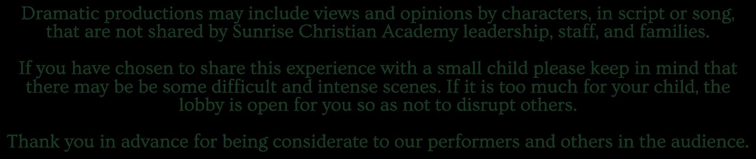 LesMisérablesisamusicalaboutgraceandredemptionthatisaconstantfocusonChrist.On countlessoccasions,ithasbeenrecommendedtometodirectthismusicalatSunrise,andI havepusheditasideasimpossible.However,afterDanielColwell(ourconductor)showedme thatthereisaneditedversionforhighschools, Irealizedthatthisisabsolutelythebest choiceforSunrisetoperform.Ihavenearlywalkedawayfromthischoicenumeroustimes, butGodkeptpullingmebacktoitclearlyshowingmethatthisiswhatHewantedustodo thisyear.TheSunrisedramadepartmentwasstartedbyDavidFitzgeraldin1993,andthe torch - carried on by various directors and music teachers who have poured into these studentsovertheyears-hasbeenthenecessaryfoundationtobuildourdramadepartment forthismusical.(AspecialthankstoJenniKelleywhohadeveryoneofthesestudentsin elementaryschool!)
