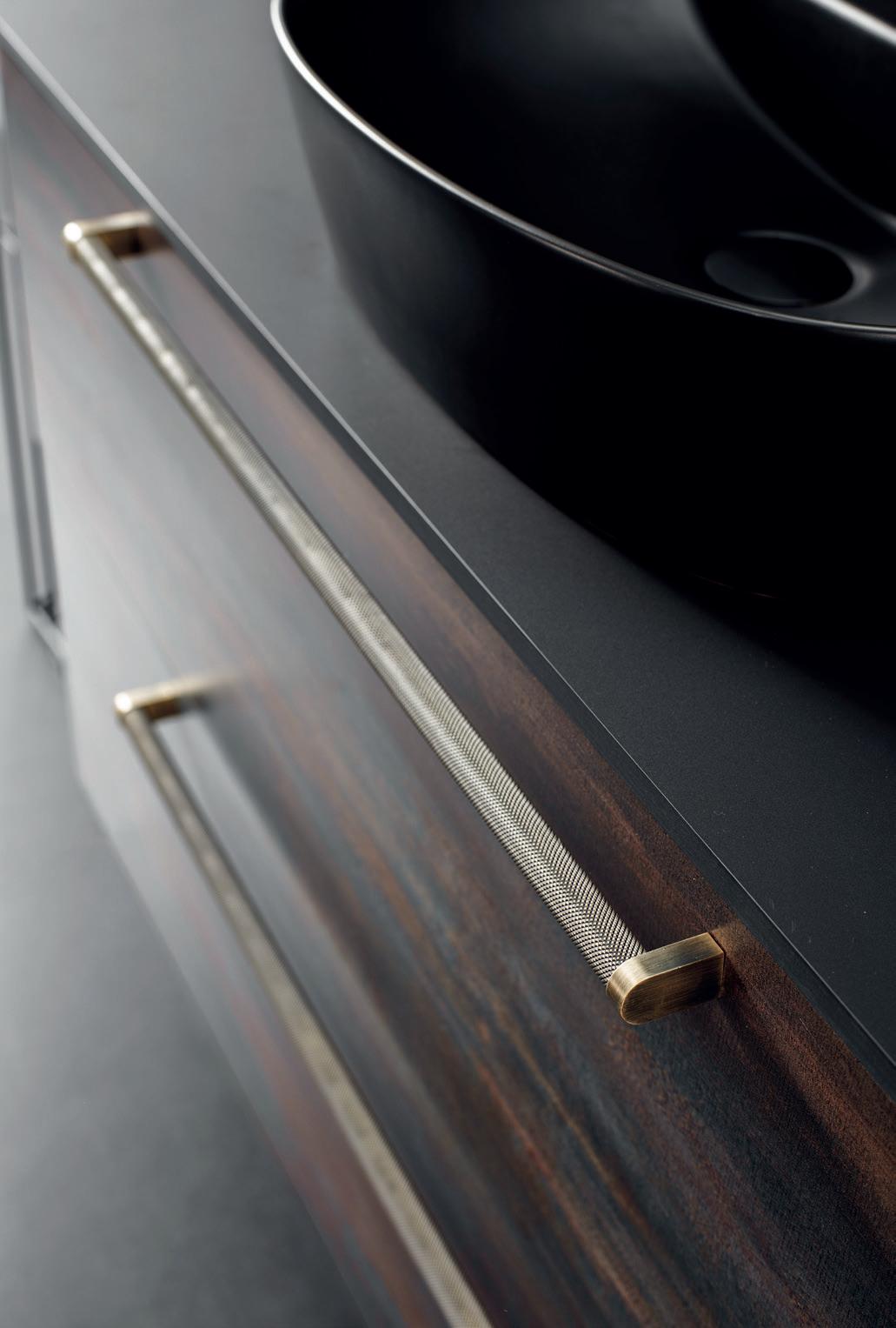 1. Como UNO LUSSO 2 x 90 i Matt Hvit, DEKTON Ceppo benkeplate, Handmade ART servant, Urbano armatur og Tropea speil. 2. Detalj Exclusive Valnøtt front, Leone bronse håndtak. 3. Detalj av åpen skuff.