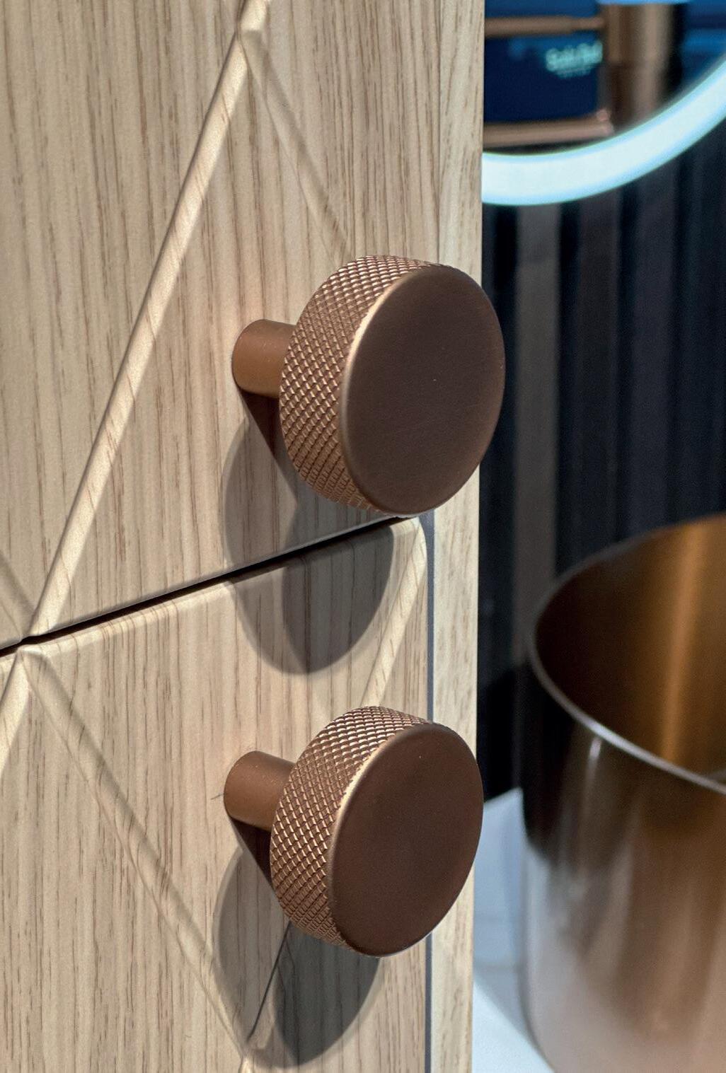 1. Como LUSSO 180 i Høyglanslakkert Myk Brun, Dekton Ceppo benkeplate, PAGANO Oval i Karamell, Urbano armatur. Høyskap og Brindisi DUE Speil i Gunmetal. 2. Como LUSSO 90 i Varm Savanne, Dekton Entzo benkeplate, SANDRO Rund, Urbano armatur og NEMI speil 3. Handmade VEKST servant og Savino armatur bronse på Como LUSSO. 4. Miljø LUSSO Savanne. 5. Viser grepsfrie fronten på LUSSO i Muskat. 6. Detalj Høyskap. 7. Miljø.