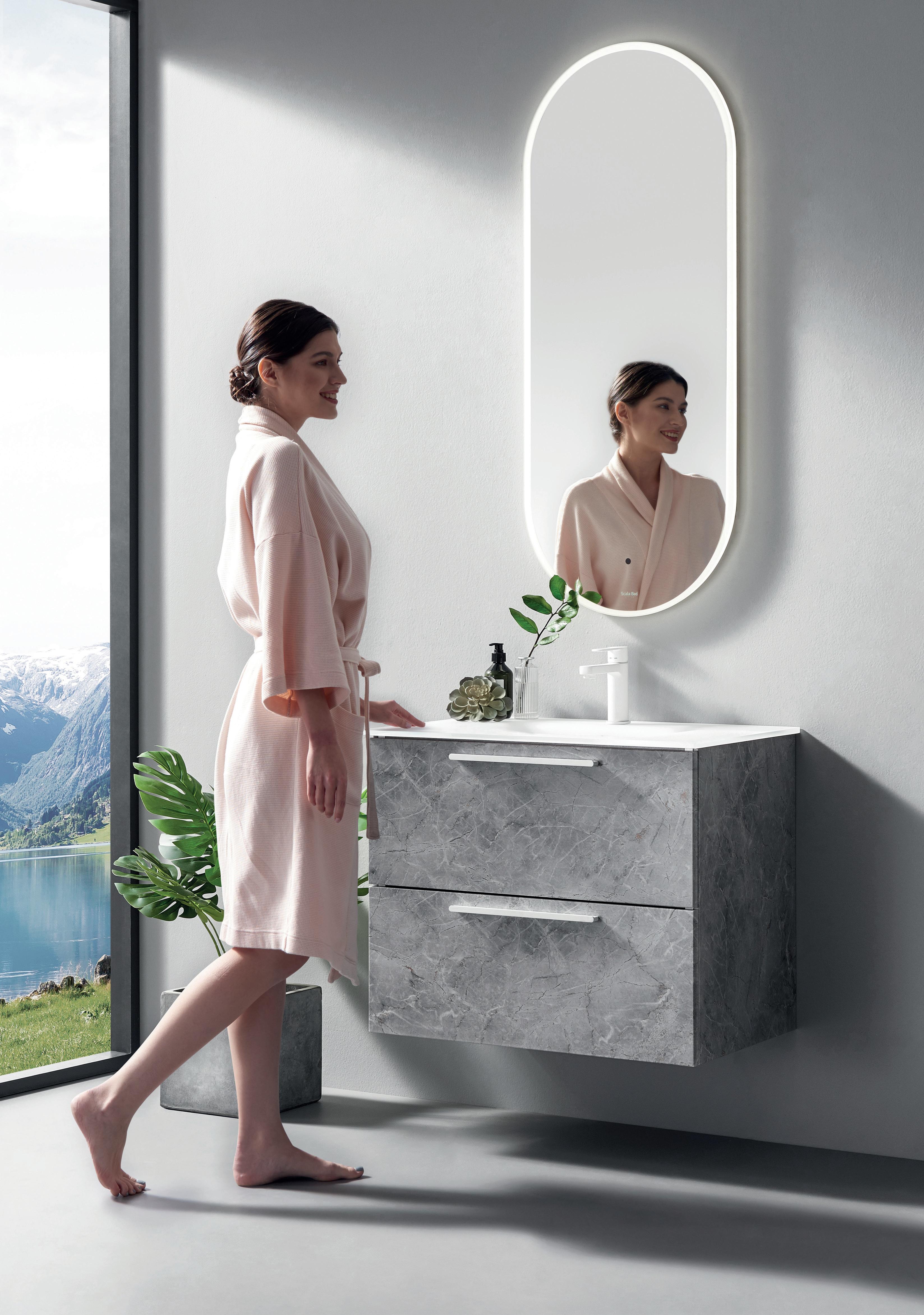 Med høyde på 100 cm ruver BOLSENA over ditt baderomsmøbel og gir maksimal speilflate. Ramme i 4 forskjellige overflater. GHOST, Backlight.