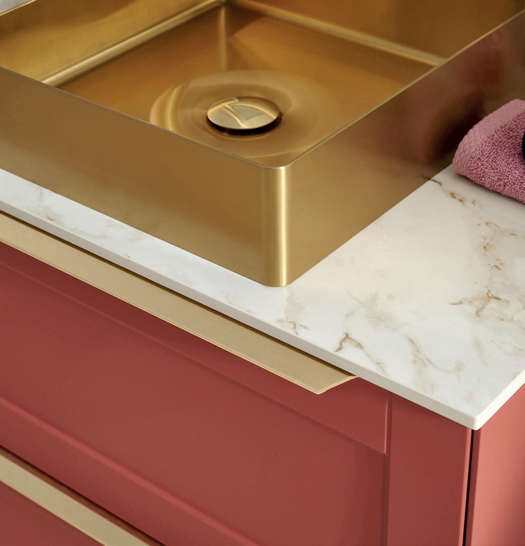1. Como UNO 240 i Exclusive Stående spile, Eik, Ponza, Listhåndtak, Celino glasservanter i sort, Corso armatur og Tivoli speil. 2. UNO 120, TREND. Eik, Fabio kobber håndtak med bakplate, DEKTON Ceppo, Sabrina servant, Urbano armatur og Minori speil. 3. Detalj Dempet Rosa DECO 4. Como UNO LUSSO. 5. TREND Toscana Rød, Ciro, DEKTON Ceppo, Romano servant og Minori speil.