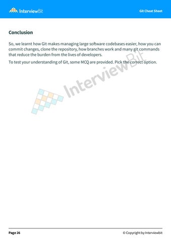 Conclusion So, we learnt how Git makes managing large so ware codebases easier, how you can commit changes, clone the repository, how branches work and many git commands that reduce the burden from the lives of developers. To test your understanding of Git, some MCQ are provided. Pick the correct option.