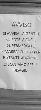 In ordine tempor ale , il pr imo a chiudere i battenti è stato il super mercato, tr a i più gr andi della città Una mattina i clienti hanno trovato le ser r ande abbassate e un car tello con su scr itto: “Si avvisa la gentile c lientela c he il supermercato r imarrà c hiuso per r istrutturazione