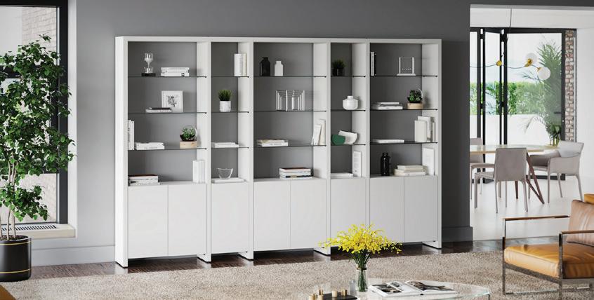 Grey-tinted glass shelves are secured to the frame, recessing as the slope ascends