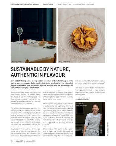 Only salt is allowed to highlight the ingredient’s essence and bring out its true flavour.” The result is cuisine that is honest and refreshingly unpretentious – a place where regional integrity and creative simplicity meet on every plate. www.bellaslokal.de Isabelle Pering. Photo: Linda Deutsch