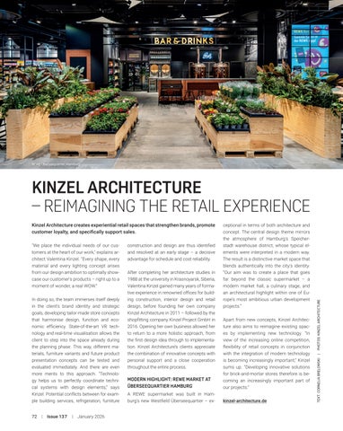 ceptional in terms of both architecture and concept. The central design theme mirrors the atmosphere of Hamburg's Speicherstadt warehouse district, whose typical elements were interpreted in a modern way. The result is a distinctive market space that blends authentically into the city's identity. “Our aim was to create a place that goes far beyond the classic supermarket – a modern market hall, a culinary stage, and an architectural highlight within one of Europe's most ambitious urban development projects.”
