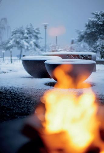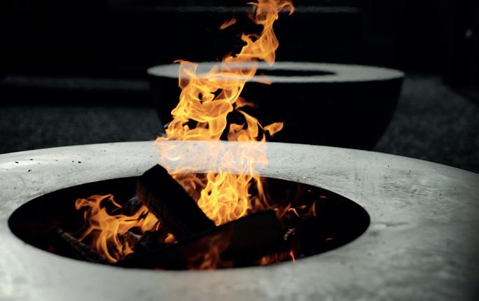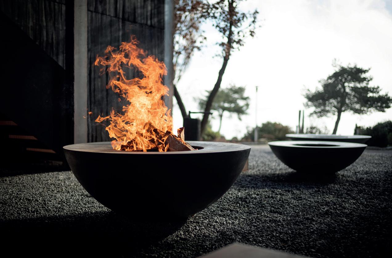 in der Runde zu wärmen und zu genießen. Im Winter verhilft die bodennahe Skulptur gar zu warmen Füssen: „Selbst bei einer Temperatur von um die Null Grad kannst du noch barfuß am Feuerring sitzen. Besonders die Frauen wissen diesen Aspekt zu schätzen”, freut sich Reichlin. Die Hitzeverteilung ist derart, dass die untere Außenwand der Schale – nahe an den Füßen der auf Filzkissen sitzenden Genießer –die wärmste Region bildet. Denn die Glut ist der heißeste Teil des Feuers.