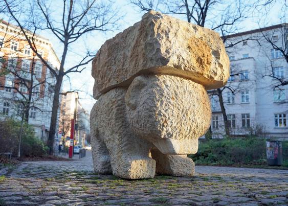 pandemic years speaks of the load that everyone was bearing at the time. For many more interesting interpretations by Berliners and visitors of all ages, click on the website video at www.lastenbaer-berlin.de. My own first impression was that the sandstone sculpture depicts a polar bear with an ice block on its back and thus stands for climate change and its impact on nature. As a matter of fact, the sandstone bear has meanwhile become an endangered species itself: The much beloved XXL version in front of the church can only permanently stay if enough people put a word in, aka sign the web petition on the above mentioned website. You can also support the cause by purchasing a mini bronze version: www.kleinervonwiese.com/stefan-rinck-lastenbr-edition. The original senate permit has run out at this point, however for the moment the bear is still there, albeit surrounded by a construction fence.
